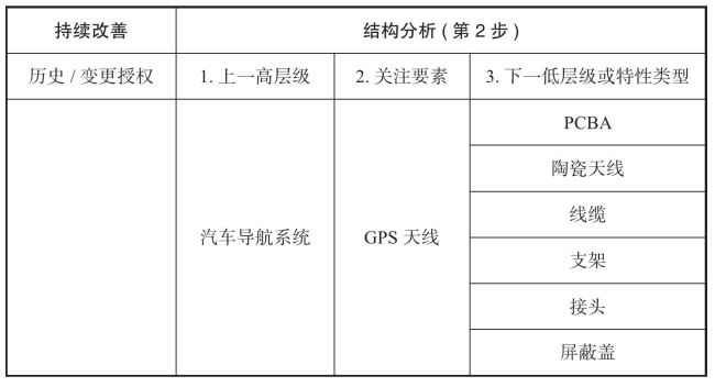 假设某公司是做GPS天线的,先做系统的DFMEA,结构分析表如表3-3所示。关注要素是要分析的对象,如果要分析子系统DFMEA,关注要素就是PCBA或陶瓷天线,上一高层线就是 GPS天线,下一层级就是PCB板或IC等。