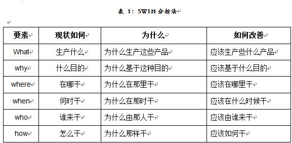 它是一种思考方法,也可以说是一种创造技法。是对选定的项目、工序或操作,从原因(WHY)、对象(WHAT)、地点(WHERE)、时间(WHEN)、人员(WHO)、方法(HOW)等六个方面提出问题进行思考。这种看似很可笑、很天真的问话和思考办法,可使思考的内容深化、科学化。如表1所示: