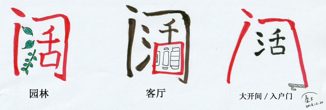 将字的部分结构、笔画与设计元素进行融合,比如将传统中式建筑的“挑檐”和笔画中的“撇、捺”结合设计。参考“阔”字的三种植入与变形(见图2-7)应用于某地产项目,分别表达产品的三个卖点:大园林、大客厅、大气的入户门。其他类似大阳台、大社区、大教育等卖点也可以参考这个思路进行创意设计。