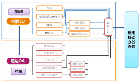 3鉴于通达OA办公系统和“钉钉”的兼容性,滨海公司班组课题实践小组创新提出将基于通达OA的移动平台与“钉钉“进行集成整合的思路,把通过通达OA系统设定的通知公告、班组日志、技术问答工作流程制定等班组管理模块整合到钉钉的微应用,形成一个移动的办公终端,原理见图9-5。