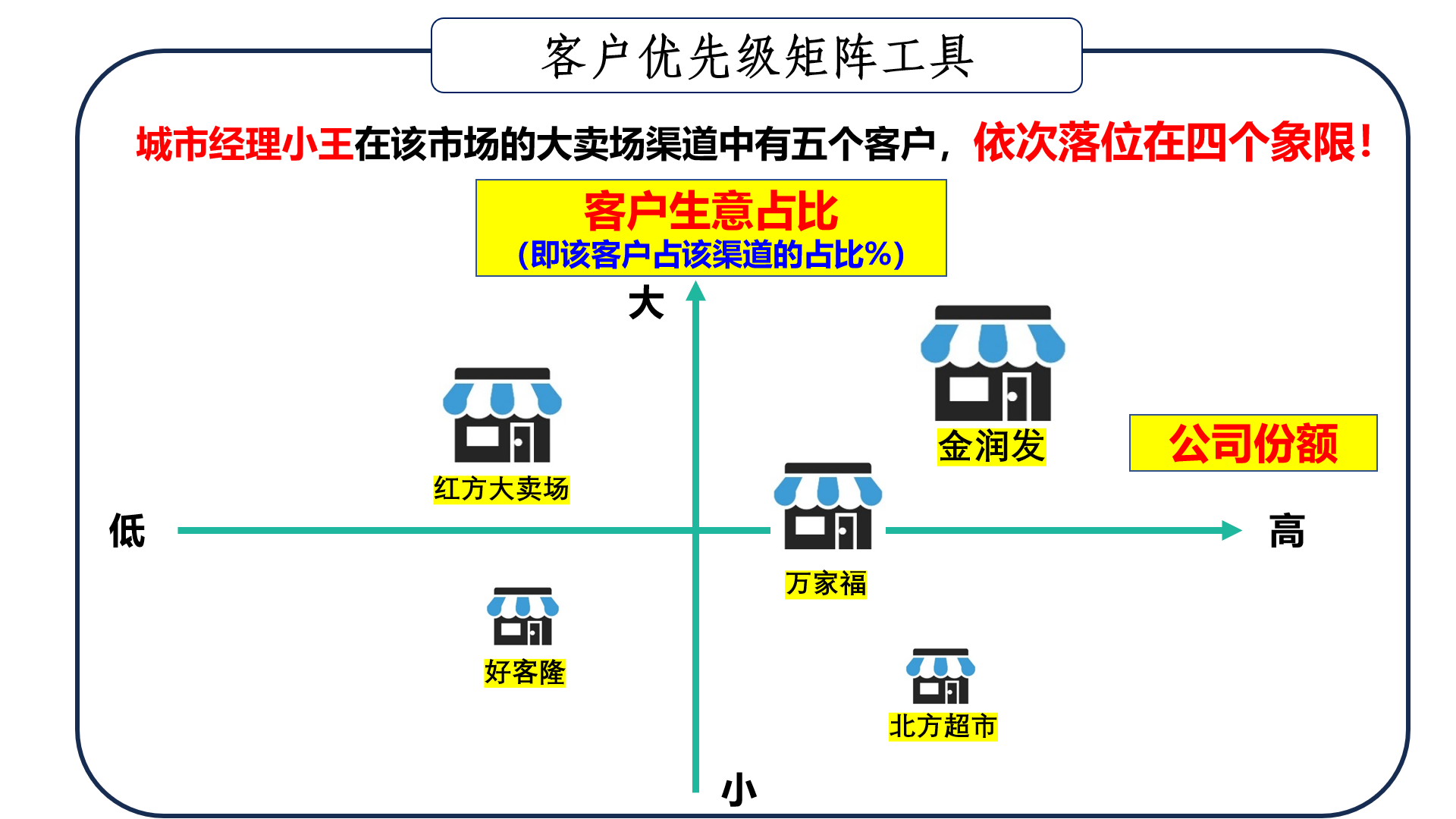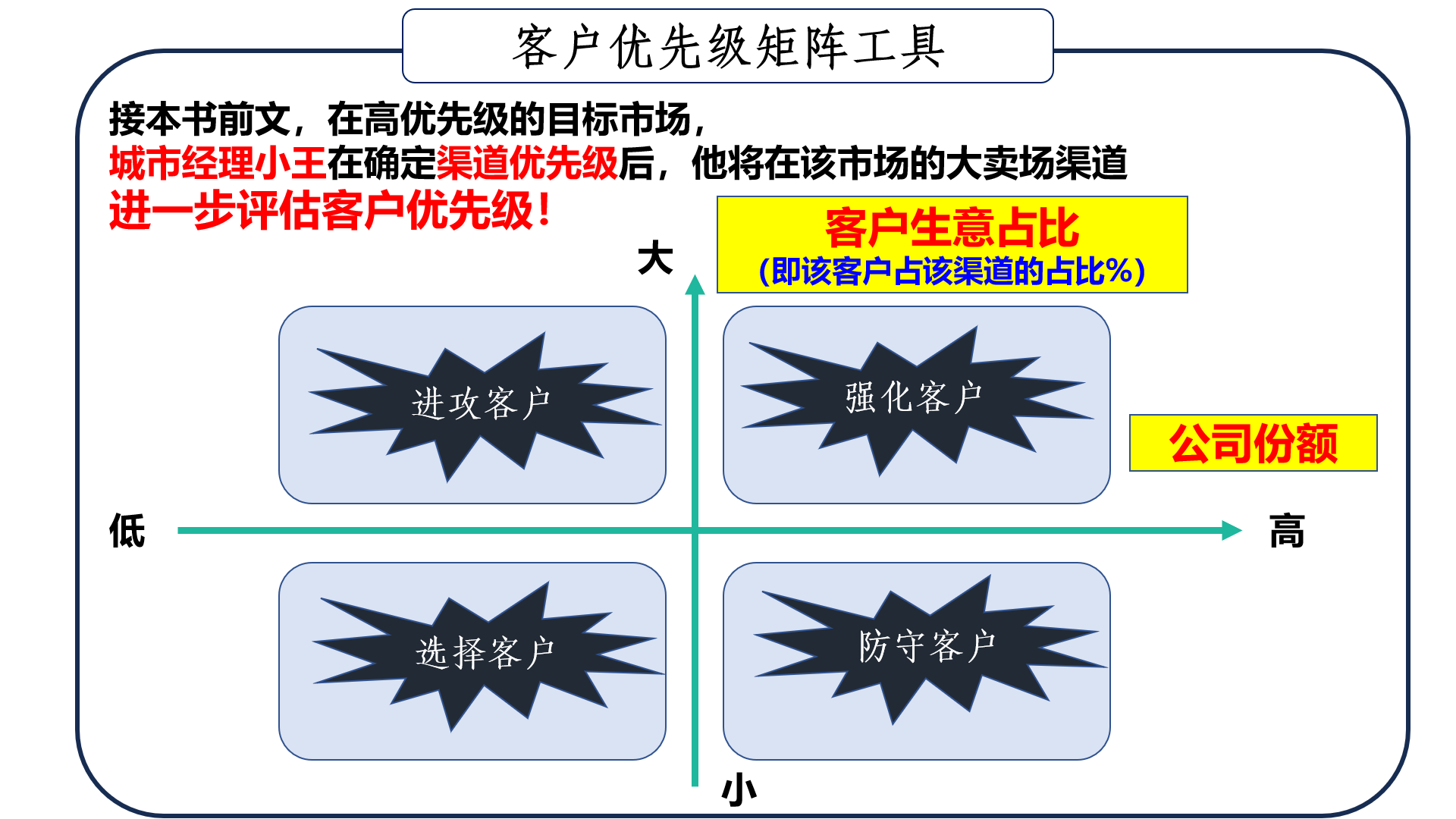 “小王,对于客户优先级的评估选择逻辑,我们将延续之前的两大轴:一个是公司份额;另一个是客户生意体量占比。这样从城市到渠道、从渠道再到客户都运用相同逻辑的工具更容易让基层销售理解和运用。”