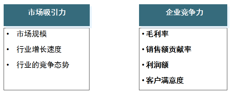 在进行三层业务链评估时,某钢业集团采用了外部行业和内部企业两个纬度考虑的方法。评估市场吸引力时,主要考虑了市场规模、行业增长速度、行业的竞争态势等因素;评估企业竞争力时,主要考虑了毛利率、销售额贡献率、利润率、客户满意度等因素。同时,该集团还采用了市场吸引力-企业竞争力矩阵来对各项业务进行分类和评估。