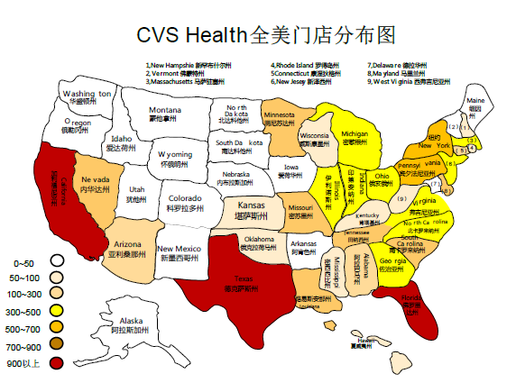 通过对CVS Health所有门店信息进行梳理,我们给出具体数据,CVS Health的门店遍布美国每一个州/特区,总共拥有11083个线下门店,其中: