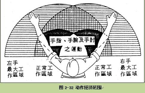 一般而言,越低级的动作,所耗费的时间越短,越不容易疲劳。为提高工作效率,我们必须利用最低级的动作工作。所以,工作物及工具的摆放距离越近越好,要尽量缩小工作范围,如图2-32所示。