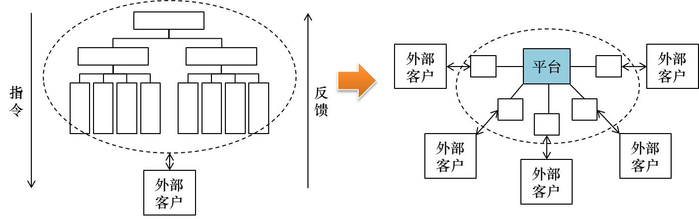 (2)平台化组织是以客户为中心。现在普遍流行的科层制管理模式是典型的指令式模式,自上而下层层传递指令,自下而上层层反馈信息,管理决策往往聚焦于金字塔顶端。在互联网时代,这种经营决策机制对外部市场需求的反应速度已经明显滞后,企业打造平台化组织的目的就是拉近企业与外部客户之间的距离,及时响应客户需求。企业与外部客户的需求贴合越紧密,对企业内部的服务与支持要求就越多,由此会导致内部组织单元分工和定位发生变化,形成内部员工客户化。