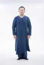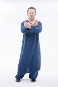 7.全身再度松沉一次,随着松沉往下的同时,双手顺势垂落。先交叉下落至丹田处,待双手指尖朝下后,手再向两旁卷开至两腿裤缝旁,掌心朝后。