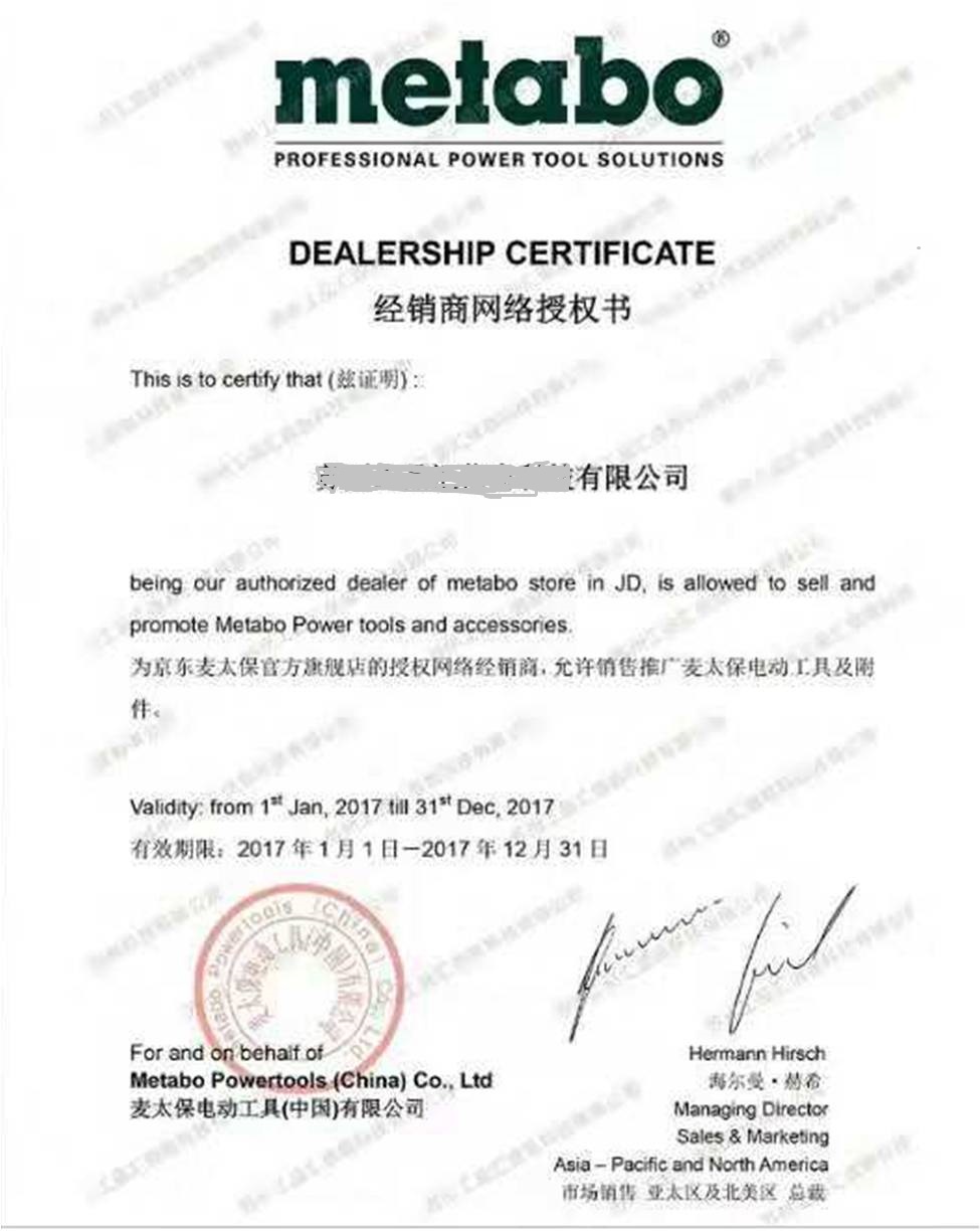 图3-4 麦太保电动工具(中国)有限公司的网络经销商授权书