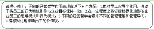 通过以上分析可以看出,经营哲学在企业中起到牵引和约束的双重作用。一方面是引导企业发展的方向,另一方面是约束员工遵守的最低准则。
