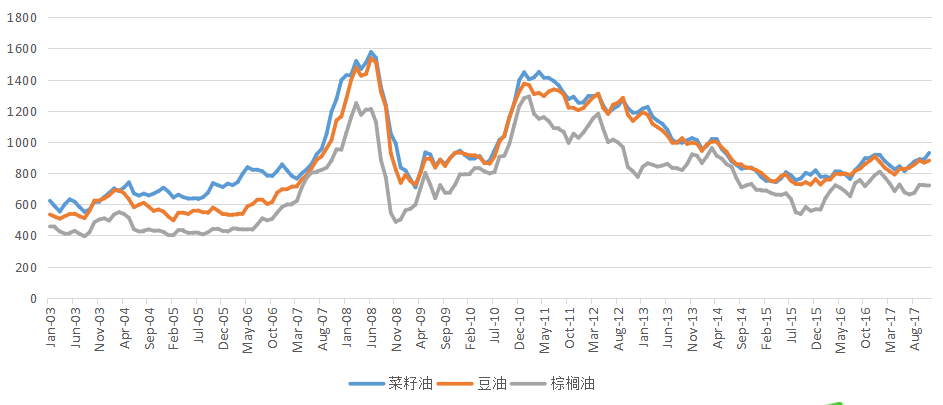 图4-2 国际菜籽油、豆油和棕榈油价格走势(单位:美元/吨)