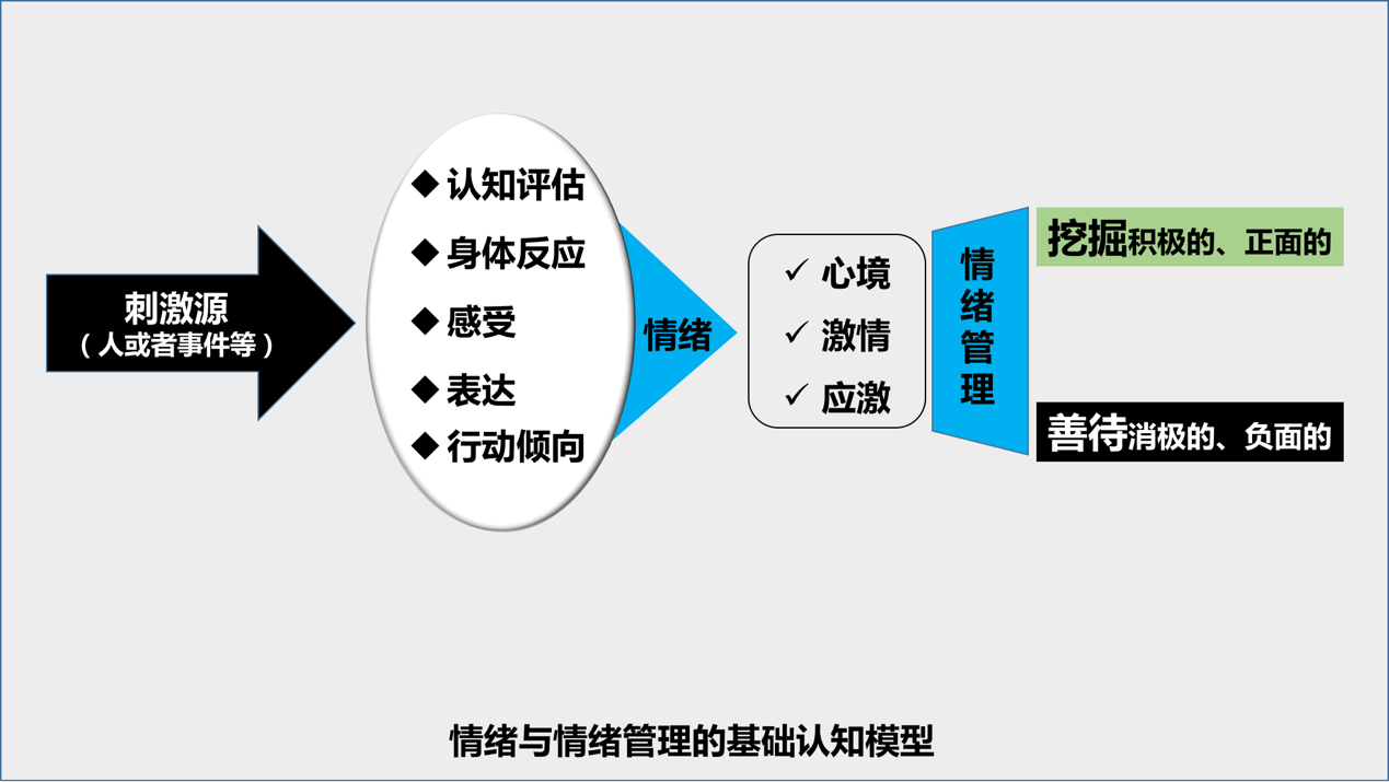 对于培训师来说也是一样,所谓的情绪管理并非强行控制情绪,更不是消灭它,而应该是“适得其所、善尽其对”。因为无论积极、正面的情绪,还是消极、负面的情绪,都仅仅是可能引发某些行为的动机因素之一,真正的行为结果最终取决于我们能否主动挖掘积极、正面的情绪,以及能否谨慎善待消极、负面的情绪。