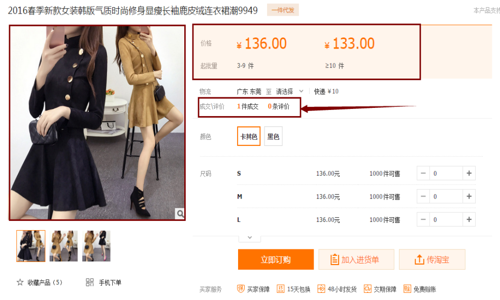 图1-14的价格是在许多人接受范围以外的,图1-15的价格在许多人接受范围以内。(请注意:这款宝贝的两张图是一样的,可能面料也是一样的)。从两张图中,我们看到第二张的销量明显多于第一张的销量,并且我们可以看出为什么他的销量会比第一张好,因为价格定位占了很大的主导地位!另外这也告诉我们一个真理:符合价格定位区间、属于绝大部分客户接受范围内的价位一定能有个好的销售量。