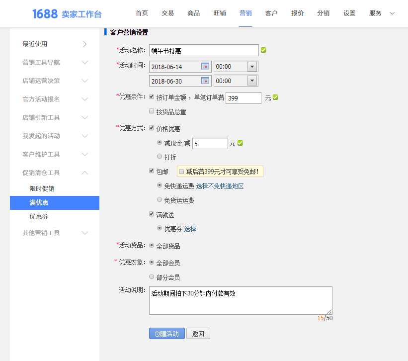 第二个站内营销工具是:满减/满包邮/满优惠工具。满优惠是商家在自己旺铺里常用的一种自主营销;能有效刺激买家下单,提升买家下单金额。商家可以在冲销量、聚人气(新品上市)、清库存、做活动等场景应用。目前可设置优惠方式:包邮(免快递运费、免货运运费)及价格优惠(减现金、打折)等。这是一个非常奏效的工具,如果没设置可能很多客户进店看到合适商品,就会问店主是否有优惠、是否可以打折、折扣是多少,设置之后,客户在下单结算时自动就可以打折,省时省力而且高效。