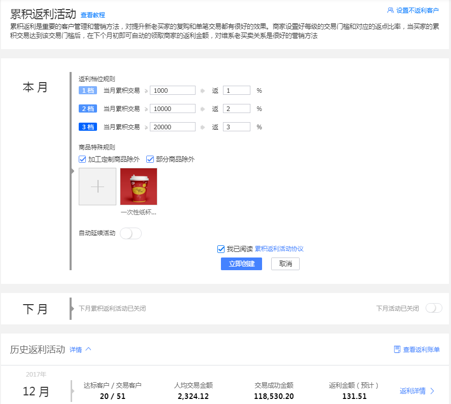 第三种营销工具是:累积返利。累积返利是一种激励买家持续购买的客户营销方式,卖家需对满足活动要求的买家按照累积交易成功金额的一定比例进行返利,以抵价优惠券的形式返利。这种模式在线下很常见,举个例子:我们常常用手机,手机有积分。中国移动、中国联通及中国电信就经常会用这种方式促销,只要积分满多少就送多少兆的流量,或者返还多少元的话费。除了上述几大运营商常用,很多微商也常用这种方法来设计自己的会员体系,用以增强代理们的黏性及活动收益。