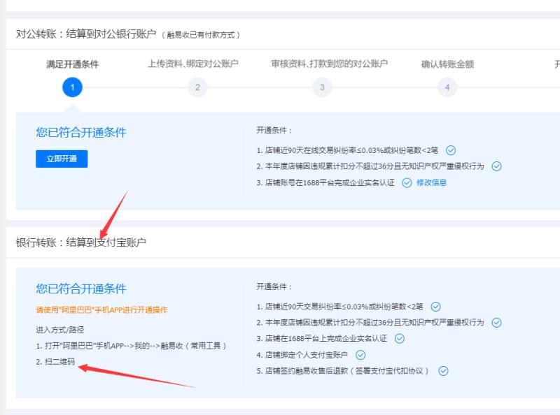 这里就不一一详细阐述了,都在后台我的阿里——交易方式——融易收、账期支付、货到付款等。这里有几个地方需要说明,第一个就是融易收,融易收建议开通,有利于大额交易,具体路径为: