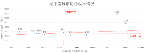 房价收入情况,在均值线下,居民收入较大且距离轴线向下偏离越大代表房价上涨潜力越强。重点关注城市有营口、盘锦;一般关注城市本溪。
