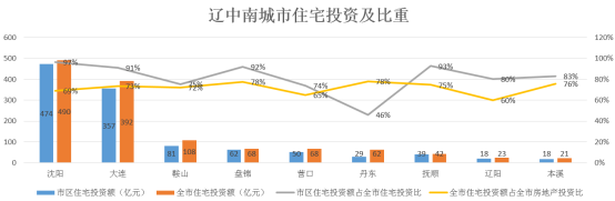 2016年辽中南城市群住宅投资额为1275亿元,住宅投资额在均值105亿元以上的城市有3个,分别为沈阳、大连、鞍山。整个城市群住宅投资额占房地产投资额比重为71.3%,市区住宅投资占全市住宅投资的88%。市区住宅投资占比低于50%的城市有:丹东,以上城市所辖县级城市房地产投资较为活跃,应重点关注。