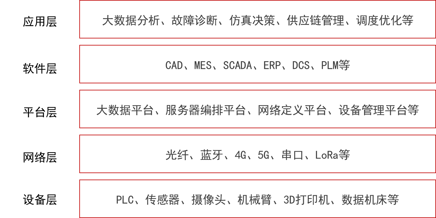 设备层主要负责数据的采集和数据的初步计算,同时接收指令执行具体自动操作;在网络层,主要负责信息的传输与转发,实现设备与设备、设备与服务器之间的通信;平台层集成沉淀了共性的数据能力和技术能力,为前端细分的工业数字化需求提供敏捷、柔性的响应能力和试错能力,例如大数据平台、服务器编排平台、网络定义平台、设备管理平台等;软件层是工业数字化场景的技术产品载体,包括生产过程自动化和管理决策智能化的信息系统,如CAD、MES、SCADA、ERP、DCS、PLM等;应用层是工业互联网的最终价值体现,是人在具体生产任务中使用系统形成的数字化业务流程实践,典型应用有大数据分析、故障诊断、仿真决策、供应链管理、调度优化等。