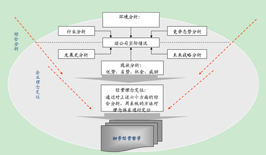 为了有效提取经营哲学理念,一般是在综合考虑客户、员工、企业三者的价值取向后进行双项提炼,具体步骤如下: