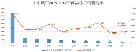 关中城市群10个城市2015-2017年三年平均土地出让住宅总建设面积为2887万平米,平均成交楼面均价为587元/㎡。