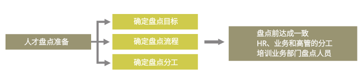 第一步是人才盘点的准备。主要目的是对盘点的目标、流程、分工与高管、关键业务管理者及HR等达成一致,并安排好有关的人员和物资。