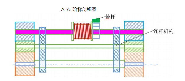 在图示右上角,有一套极具巧思的对撞装置,其主要由撞杆、销子、薄叉以及旋转轴构成。