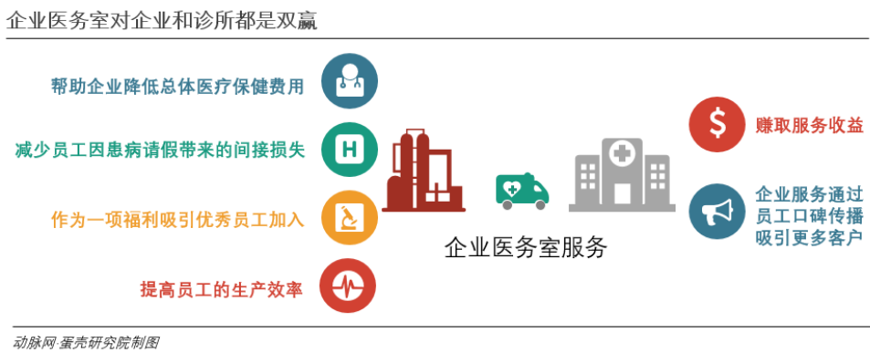 在这些合作形式中,蛋壳研究院认为企业健康管理服务可以成为一个比较优秀的客户获取渠道。企业健康管理服务的好处是明显,因此在大型企业、500强企业中常常会需要这样的医疗服务。医院提供企业医疗服务的动力不足,普通诊所往往也会因为人手不足而无法提供这样的服务。新型诊所、连锁诊所提供类似服务更符合市场,在赚取服务收入的同时,培养一大批潜在客户。
