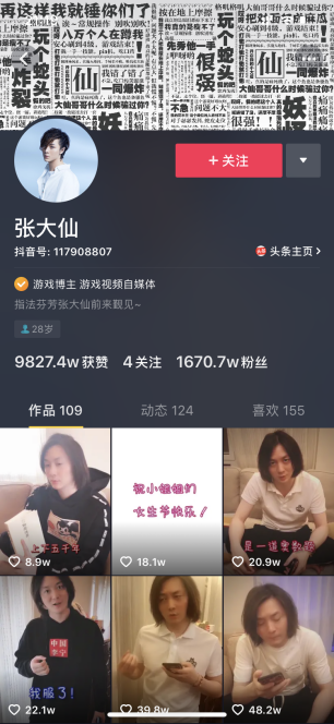 比如“多余和毛毛姐”,一个男生同时扮演男女两个不同的角色,自己与自己进行对话和沟通,没想到女版人物比男版人物更受粉丝欢迎。抖音账号“乔万旭”,主播也是一个人扮演多个角色,很受欢迎。抖音里很多男生化妆变美女的视频,都很受欢迎,比如“阿纯”。动物与人的角色互换,代表账号是“会说话的刘二豆”“金毛蛋黄”等。语言模仿,参考“张大仙”。角色扮演的账号如图5-18所示。