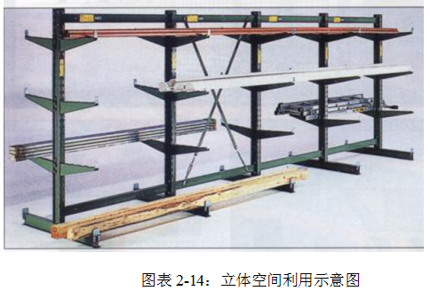 如图表2-14所示多层货架,放较轻型管材与棒材,中间有通道,顶层用行车移动,其余用人工移动。