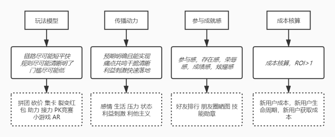 社交玩法几个重要的因素:玩法模型、传播动力、参与成就感、成本核算。几个关键性指标同时满足活动效果自然也不会差。如图1-8所示。