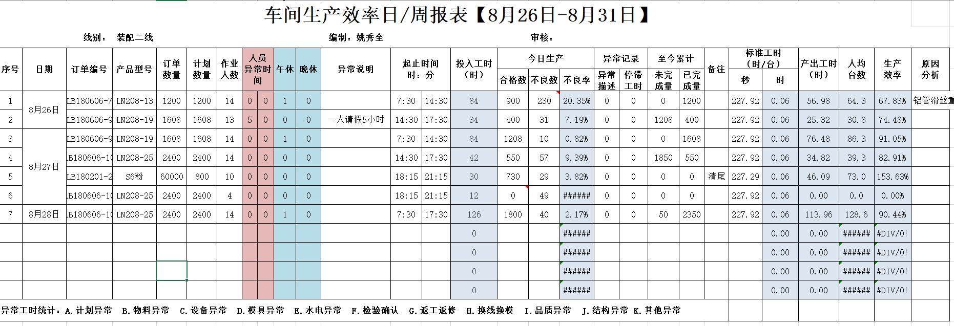 2018年6月份,我在温州开展一个项目时,企业有装配流水线生产的,一条流水线人数大约在15人左右,刚调研的时候,他们由于是计时工资,每个小时13块钱,没有进行生产效率的导入,只是统计一下今天这条线生产了多少数量,至于为什么生产这么多数量,出现了说明异常都没有进行统计,企业的总经理特别的着急,因为他看到公司给员工计时工资,但是员工工作并不积极,每天并没有努力的工作,经常看到员工在流水线上玩耍,为了提升工作积极性,提高产品的生产产出,总经理特别同意导入效率报表。经过4个月的时间,效率报表终于全部导入,生产效率报表(表1-18)作为日常周工作汇报的一个重要内容。