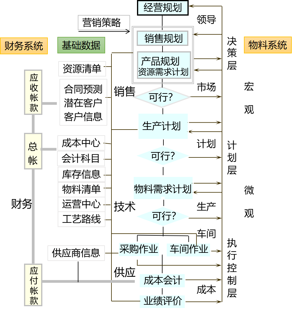 它的设计原理其实是把前3节的内容的逻辑关系设计在系统中,系统通过关系运行得出生产排产计划及物料计划,如图2-11所示。它一定要有准确的基础资料及清晰的规则作为基础,这些都必须是经过业务部及其他相关部门(财务、采购、技术等)审核通过的。通过MRPⅡ系统,可以清晰地进行以下操作: