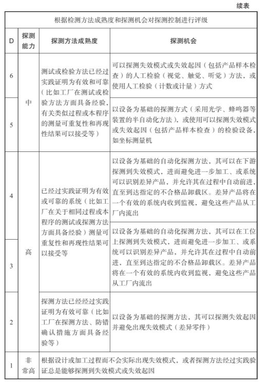 表2-8 PFMEA探测度评分表
