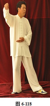 注意:单鞭在整套拳架中,起着承上启下的作用,应该注意中正。上身不可前倾,肩背不要倾斜。要呼吸自然,如欲左顾,则眼神领先于左顾; 欲右盼,则眼神领先之右盼。总之,要做到处处神意领先, 才能做到意到气到。
