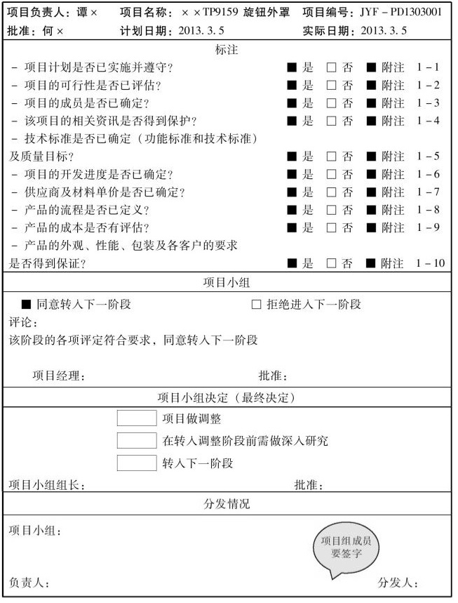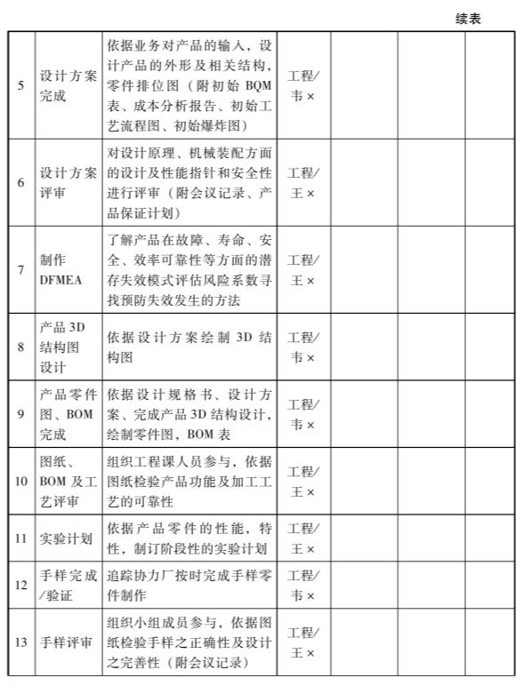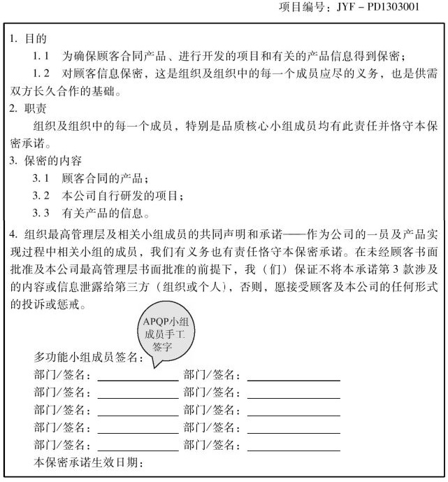 第一阶段项目总结评审前,项目经理要组建APQP多功能小组,小组成员主要由PMC、业务、品质、研发、工程、采购等部门成员组成。多功能小组要定期召开项目进度会议,就接口问题加强沟通,并签署保密协议。如表1-2-7。
