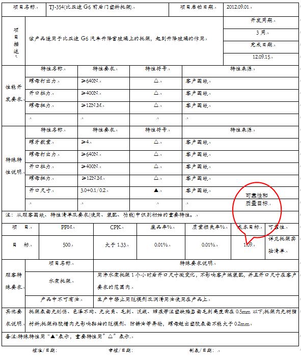 特殊特性主要包括产品和过程两种。产品特殊特性一般指原材料、半成品、成品本身表现出的特殊,如拉力、尺寸等。过程特殊特性一般从设备、工装、环境等方面表现出来,如成型参数、仓储温湿度等。特殊特性一般要用客户指定符号标示,如无客户指定符号,公司APQP程序中要明确特殊特性的符号,很多企业用“▲”表示。特殊特性如果由自己公司识别,APQP小组成员则要参与评审,并签字同意。如表1-2-4所示: