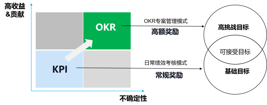 公司在OKR推展的初期,为了确保OKR实施成功,既要守正(KPI基础目标),也要出奇(OKR高难度挑战目标),鼓励员工挑战基于绩效改进的高难度挑战目标。当员工完成高难度挑战目标且产生高收益时,应给予员工高额奖励,通过利益互绑,实现上下同欲,这是推行OKR成功的关健。为了方便大家理解,我创新性地设计了KPI与OKR的相互兼容操作示意图。