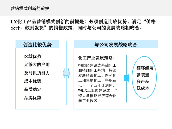 为了使LX化工自主设计安装、绿色循环产业的全资化工园区发挥市场价值,公司不断进行营销创新实践。尤其是技术出身的集团副总掌管营销以来,其理性思维与技术专长、身先士卒的领导风格,更加速了营销的创新实践。