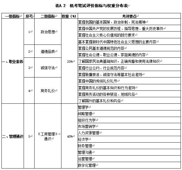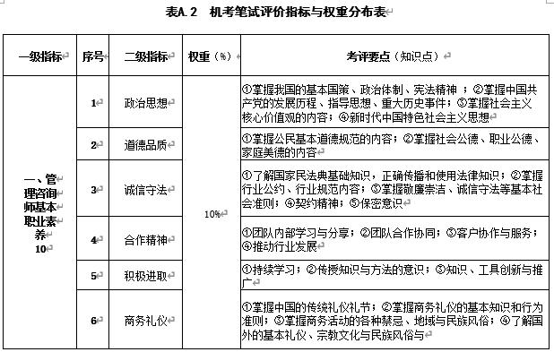为了评价管理咨询师是否达到所申请等级的咨询理论和实践水平,具备相应等级的职业咨询能力,评价机构应依本细则表A.2和表A.3所载的8项内容(涵盖了管理咨询师基本职业素养、管理咨询师通识、咨询师专业能力;学历与职称、获奖情况、咨询成果、咨询案例、咨询能力)进行评价,然后采用机考或现场答辩评审两种方式对评价对象进行能力评价。