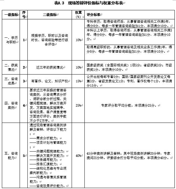 e)面试答辩评审:面试考核要求参评人根据事先提交的管理咨询案例,进行20分钟陈述和25分钟答辩。具体评审内容应符合附录A中表A.2的规定。