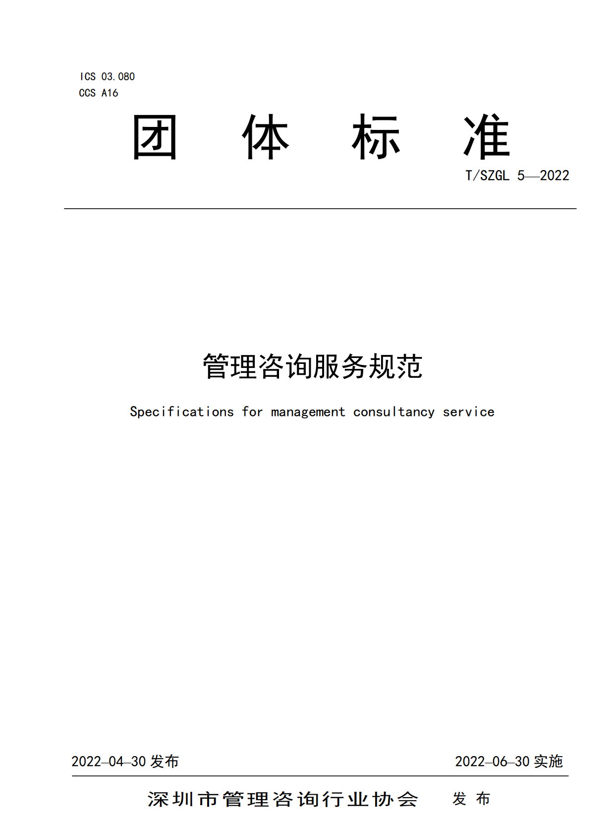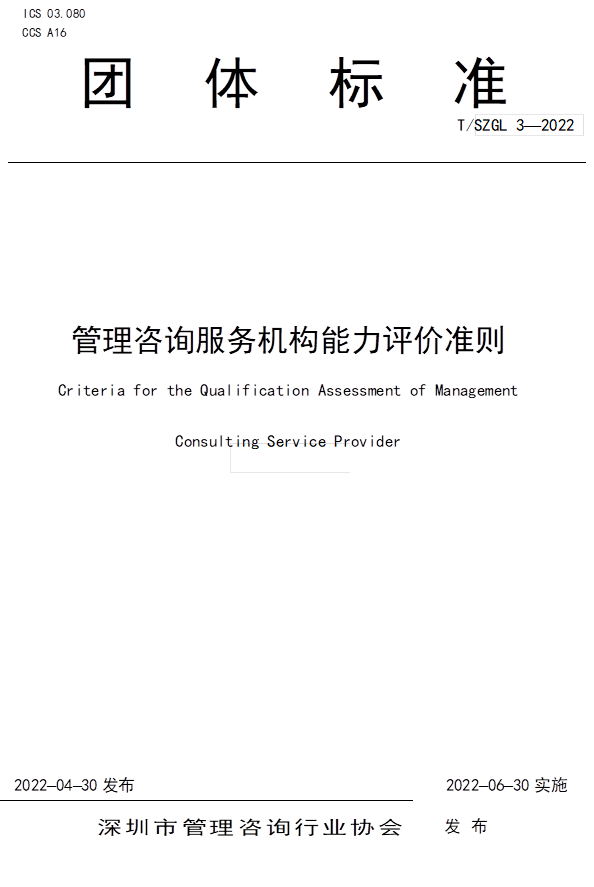 2022年,深圳市管理咨询行业协会在全国同行业中首次推出《管理咨询师能力评价准则》(T/SZGL 1-2022)、《管理培训师能力评价准则》(T/SZGL 2-2022)、《管理咨询服务机构能力评价准则》(T/SZGL 3-2022)、《管理培训服务机构能力评价准则》(T/SZGL 4-2022)、《管理咨询服务规范》(T/SZGL 5-2022)、《管理培训服务规范》(T/SZGL 6-2022)六项行业团体系列标准,并于同年7月9日向社会各界及媒体公开发布(详见:深圳市标准信息平台官网http://szbz.sist.org.cn 全国团体标准信息平台http://www.ttbz.org.cn)。