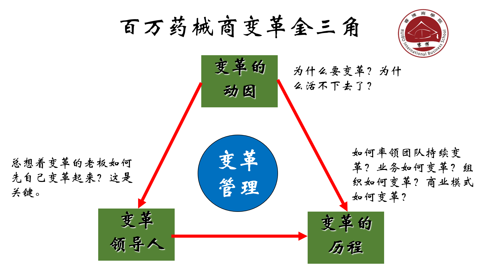 转型能不能熬过去?不仅取决于商业模式,更重要的是组织和人事,都要跟上。我曾经提出“百万药械商的变革金三角模型”,缺少变革的动因、变革的领导人,是无法完成伟大的变革历程的。如图10-5所示。