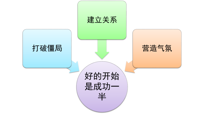 通过打破僵局建立关系和营造氛围,让学员进入培训的状态,正所谓“遵循先处理心情再处理事情的原则来进行开场。”