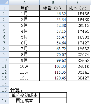 单元回归的成本分解可基于Excel电子表格实现。例如,在工作表中录入数据,如表7-3所示。
