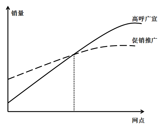 从图中,我们可以看到,在品牌导入期,销售网点较少的情况下,引导消费者主动购买产品并形成习惯是提升销量的核心,试吃、导购员推销、赠品促销等地面促销推广活动正是通过主动性的引导迅速提升产品销量,短期内达到销售目标,为初建期的品牌积累资金,使品牌顺利走出生存期。此阶段地面促销推广的动销效果更好,投入产出比更经济,而高呼广宣在短期内对销量的提升不显著。当然,这一时期高呼广宣在潜移默化地对消费者进行品牌价值教育,循序渐进地在消费者心智中建立品牌认知起积极作用的。当品牌进入发展期,终端网点的数量增多时,地面促销推广与高呼广宣形成一个交叉点,此阶段以后地面促销推广的劣势凸显出来,不仅是地面促销推广的费用超越广告费用而占据营销投入的大部分比例,动销的整体效果也不如广告。广告对销售的促进作用开始优于地面促销推广,此时应该导入广告促销的手段。而且持续性的地面促销推广将使消费者对促销形成依赖性,甚至导致“有促才销,不促不销”,无法建立品牌忠诚度。