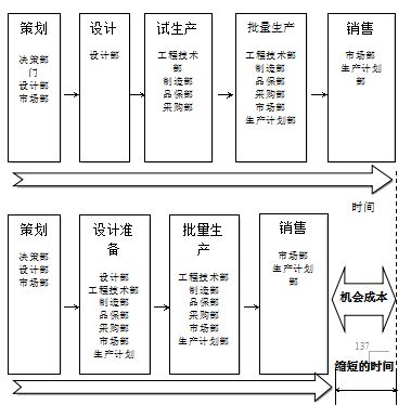 相关部门同设计部门一起参与设计准备,不仅仅是向设计部门提出各种改善建议,同时,在此阶段为了批量生产,各自独立完成标准化、教育训练、设备、场地的准备工作。例如,工程技术部编制工艺流程,为了保证品质设计开发与制作辅助用的设备、工装夹具等;制造部要对批量生产用的场地、生产设备进行评估并购入,完成作业指导书编制、人员采用与训练等方面工作;采购部要根据设计部的设计图纸,决定供应商、零件单价、约定合同等等;品质保证部对新产品的抽样检验的实施方法、验证项目确定,同时按法律、法规要求,对产品进行商品检证等等。这样一来,各部门以设计部为中心,以齐头并进的方式进行生产准备,就大大缩短生产准备时间,从而能让新产品尽早投放市场。先于竞争对手投放市场是获取最高利润的最有效方法。