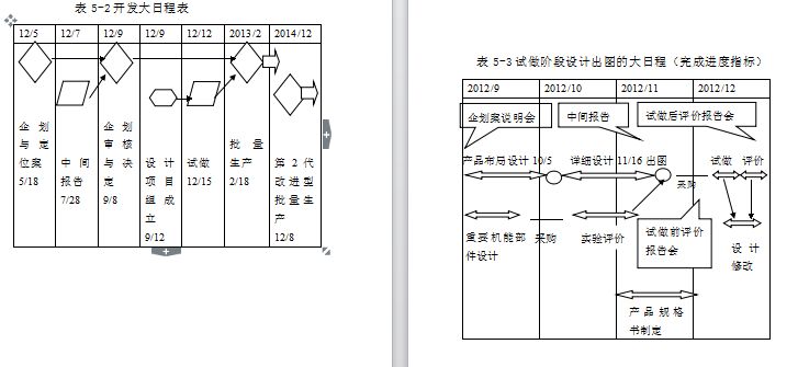 图5-7模式就是由项目组经理负责制定整体计划。整体计划包括设计开发大日程,即什么时间进行试做及试做多少台,试做每台的目的与用途,什么时间正式批量生产等。整体计划还包括新产品开发准备过程中各部门需要完成的业务内容(如表5-5),新产品开发准备过程中各项管理指标的目标值(如表5-1)。整体计划也包括设计开发项目管理的组织图,在设计开发项目组成立前,由公司要求各部门选定开发准备过程中自己部门的派遣成员。当然,在本章开始提到的“企划阶段决定的主要内容”,作为附件告知相关人员(注意,什么样资料传达到什么级别,公司应在资料上明确标注,以便保密)。各部门选定的参加设计开发项目组的成员,根据整体计划要求,代表本部门制定所在部门在新产品准备过程中实施的详细计划,再经过本部门经理审核后,提交项目开发组在协调会上进行协调沟通与审核。例如: