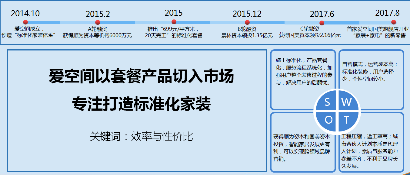(1)2014年爱空间成立,在打造标准化的基础上自建供应链,通过施工流程标准化和信息化,实现交付标准化和服务标准化。