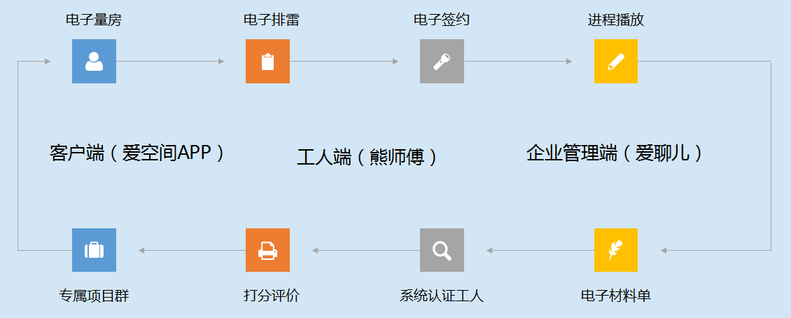 整个装修过程包括36个环节,600多个SKU材料、需要4.5吨建材,跟200多个陌生人打交道,面临300多次决策和多个陷阱。爱空间坚信用信息技术改变家装行业,开发出信息系统全景图,通过3个APP+19个系统的无缝对接,全面打通所有客户端、工人端、企业管理端等环节,将移动互联信息技术赋能家装,保障强而有力的规模化交付。