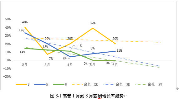 以A企业为例,该企业有3名高管员工。通过观察他们月度薪酬增长率的趋势图(如图6-1所示),我们可以发现S高管的薪酬相对于其他高管是较高的,但从整体趋势来看,其薪酬增长率呈下滑态势。这说明,尽管S高管的薪酬水平较高,但其思维的进化速度可能在减慢。因此,薪酬增长率的上升趋势可以作为衡量员工思维进化速度的重要指标。