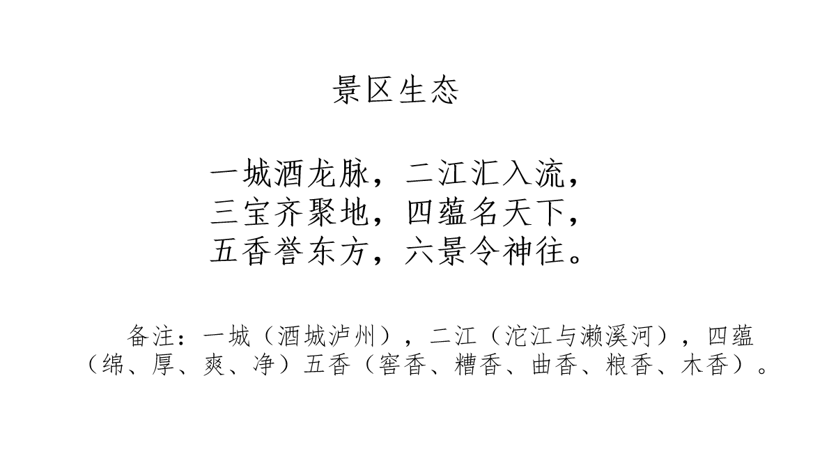 六景分别是濑溪河、酿造一二车间、藏龙洞(楼)、百年窖池群、洪春花曲坊(文化照壁)、玉蝉酒庄(酒体包装中心、文化室、玉蝉赋)。用诗来概括如图5-1所示。